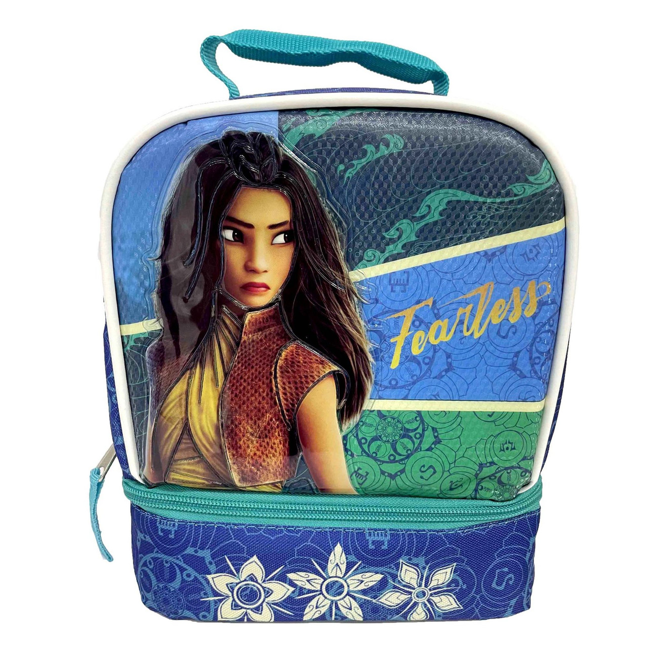 - Raya & the Last Dragon insulated lunch box has a darling Raya pattern on a blue/green background with "Fearless" sentiments