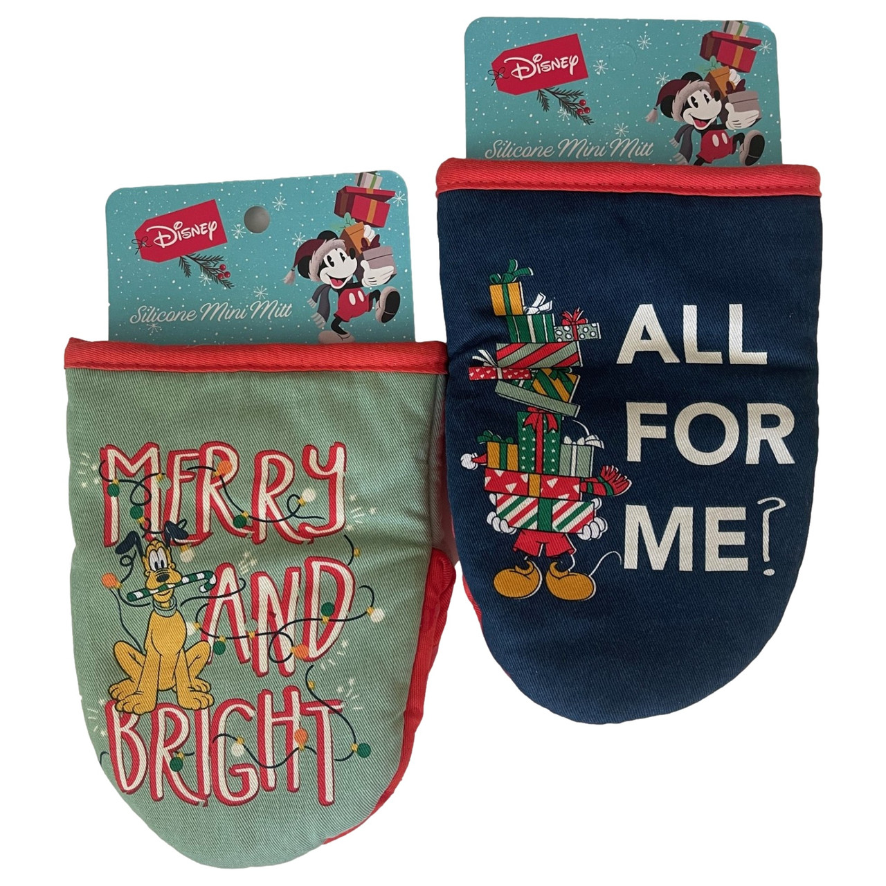 - The mitts feature Disney Christmas designs with Mickey Mouse and Goofy. One is green in color with "Merry and Bright " sentiments, the 2nd has dark blue coloring with "All for me" sentiments