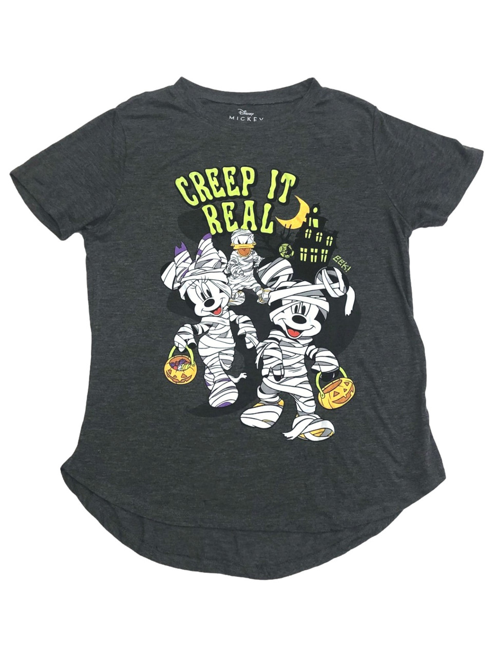 You will love wearing this fun short sleeved Mickey Mouse, Minnie, & Donald Duck themed "Creep it real" Halloween t-shirt with your favorite pants or shorts!