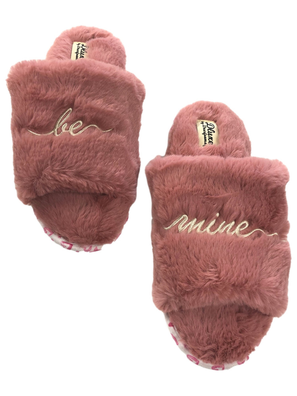 You will love the cozy plush feel of these pretty pink open toed memory foam "Be Mine" love themed slippers with rugged rubberized indoor/outdoor soles!