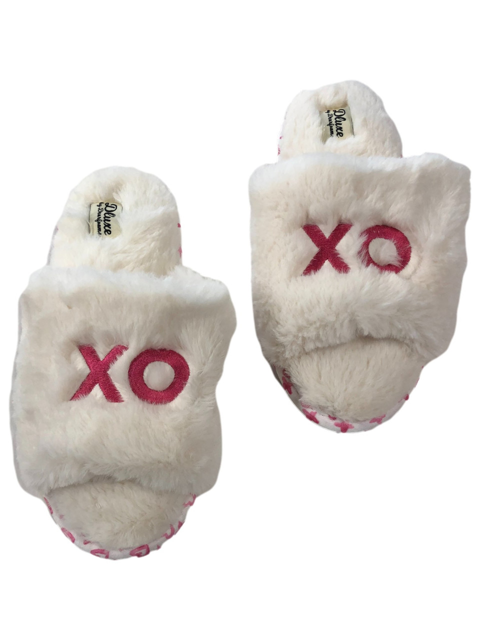 You will love the cozy plush feel of these pretty white & pink open toed memory foam "XOXO" love themed slippers with rugged rubberized indoor/outdoor soles!