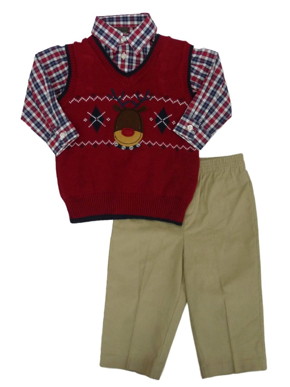 This stylish clothing set is perfect for your family pictures and holiday events! It includes a red knit sweater vest with reindeer design, a patriotic plaid shirt and khaki corduroy pants.