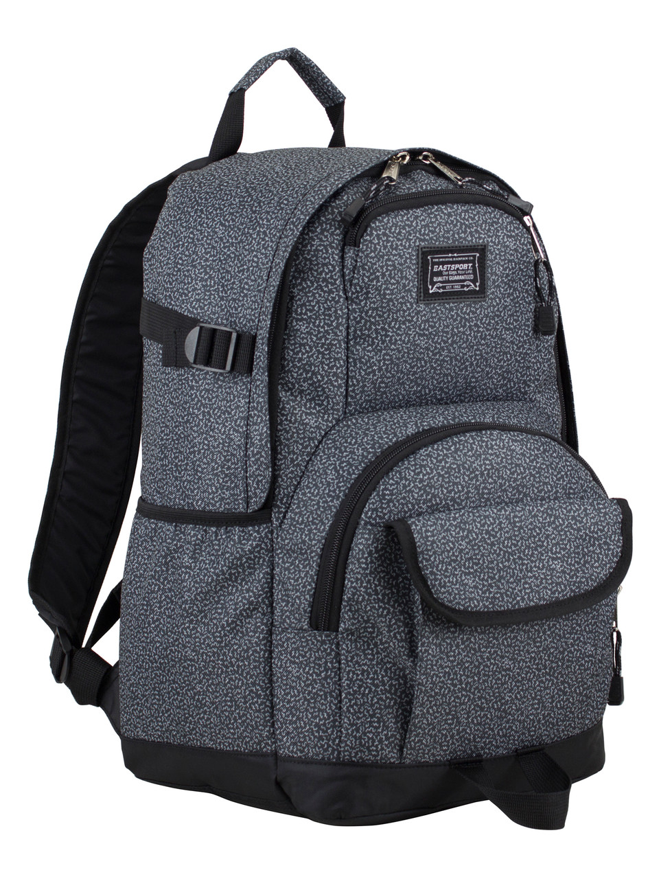This multi-purpose Eastport backpack with tech sleeve is perfect for everyday use or school. It has a sketchy zig zag pattern on a black background with black trim. The bag is equipped with a large main compartment with interior laptop sleeve, three front pockets, interior mesh pocket and two side hydration pockets