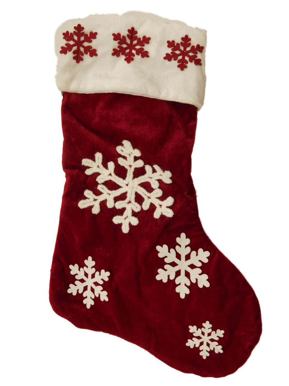 This pretty red & white velour snowflakes Christmas stocking is sure to be a holiday favorite.