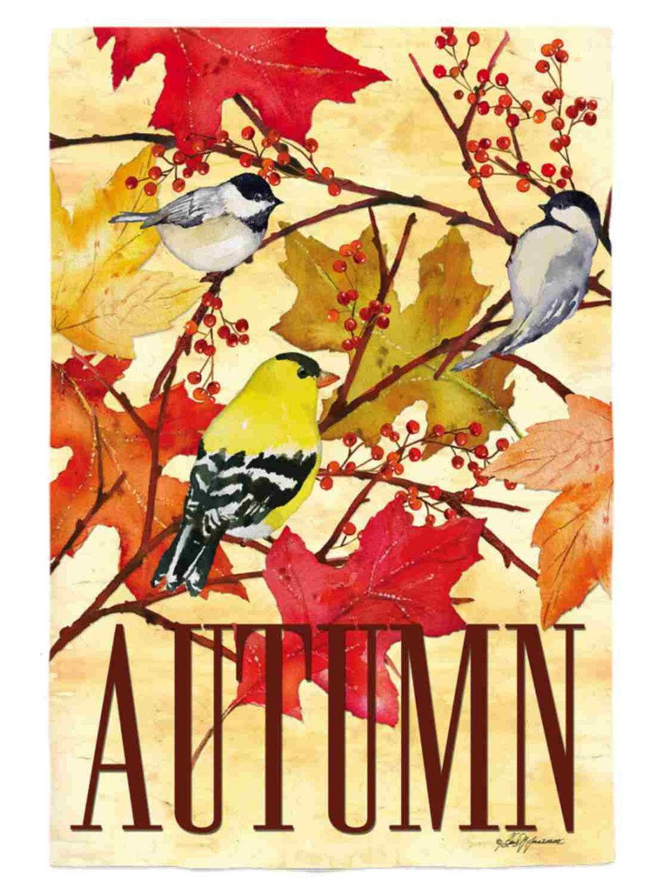 This pretty garden flag features birds in a tree with leaves all around and says, "Autumn." Perfect for welcoming in the Fall season!