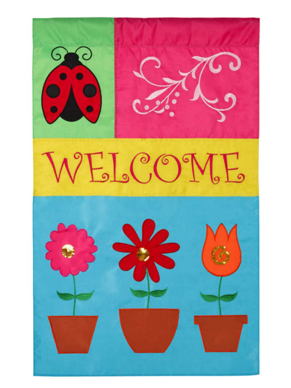 This decorative flag features an applique of flowers representing the different seasons with a ladybug and says, "Welcome." This flag will look pretty in the entrance way of your home!