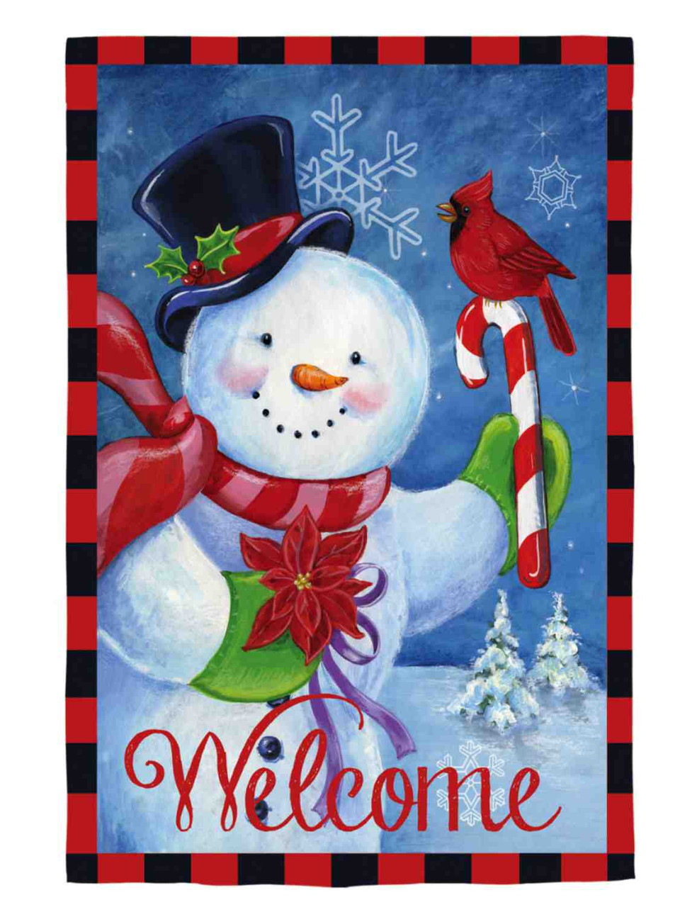 This cute decorative flag features a smiling snowman holding a candy cane and says, "Welcome." Perfect for the Holiday season!