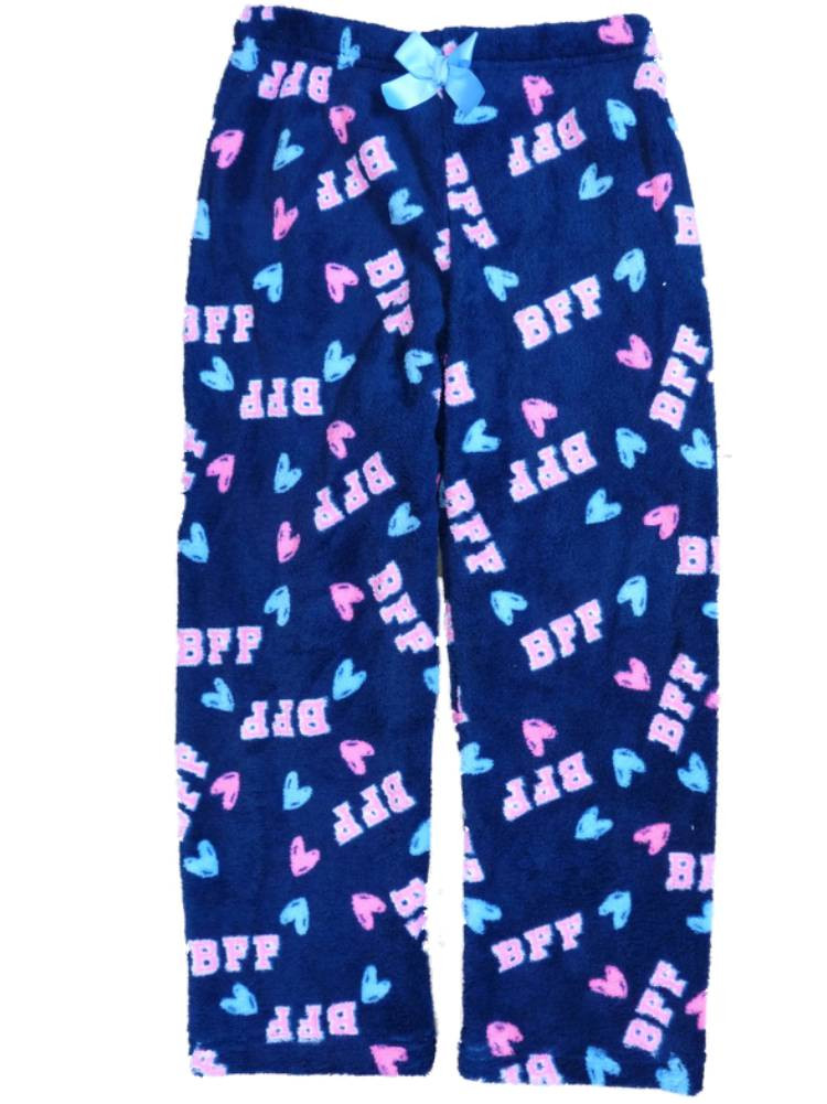 These cozy dark blue plush fleece pajama bottoms have pink and light blue "BFF" and heart print allover.