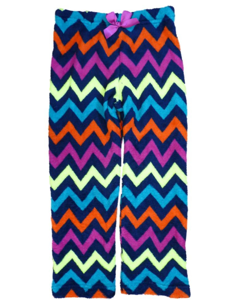 These cozy plush fleece pajama bottoms have multicolor chevron print with a pink tie at the waistband.