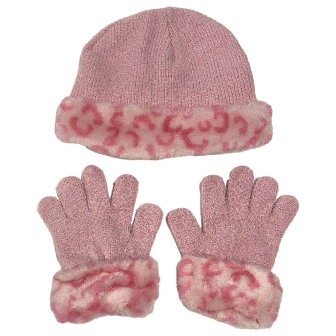 - Faded Glory Girls Pink Knit Leopard Print Hat & Gloves Beanie Set
