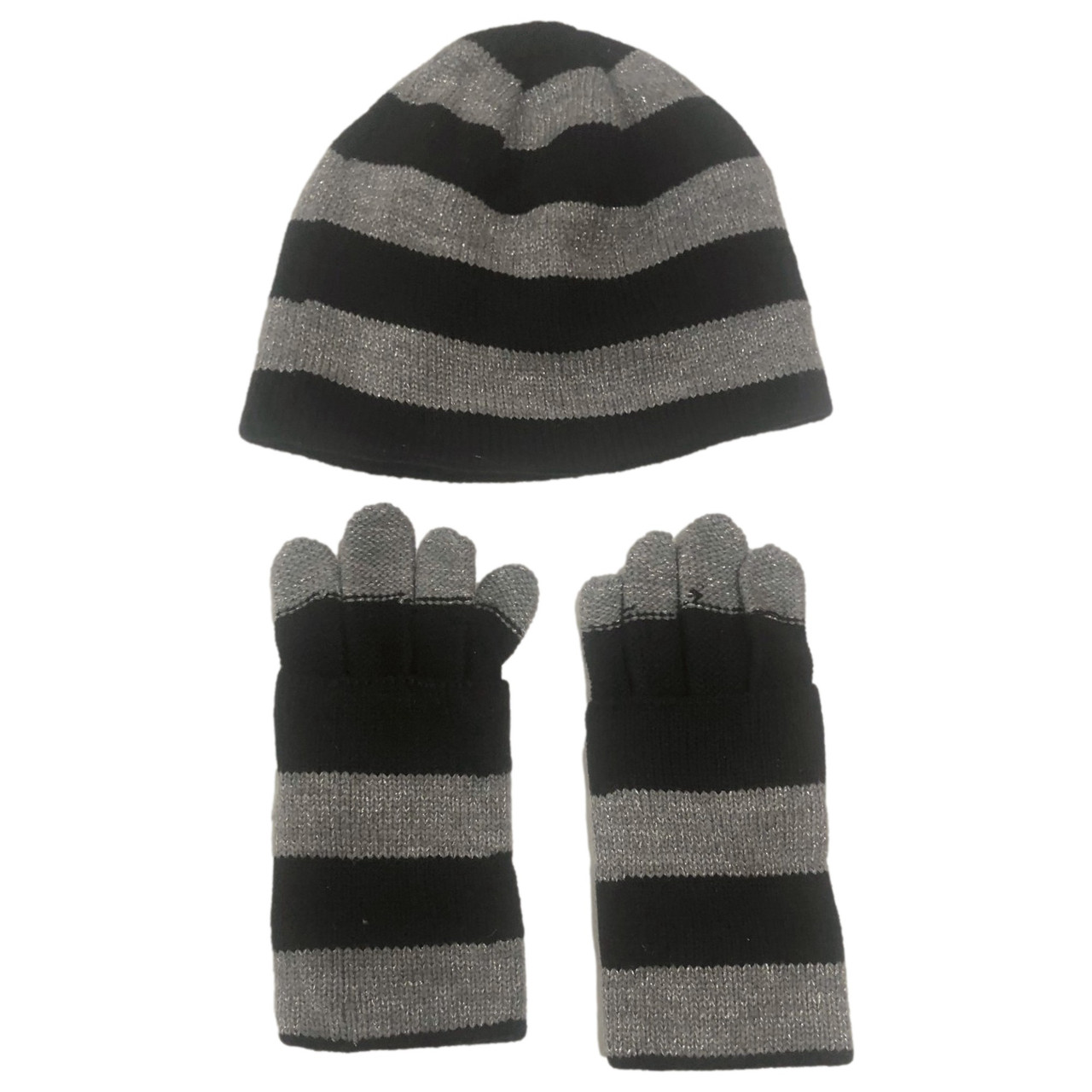 - Faded Glory Girls Silver & Black Stripes Metallic Hat & Gloves Beanie Set