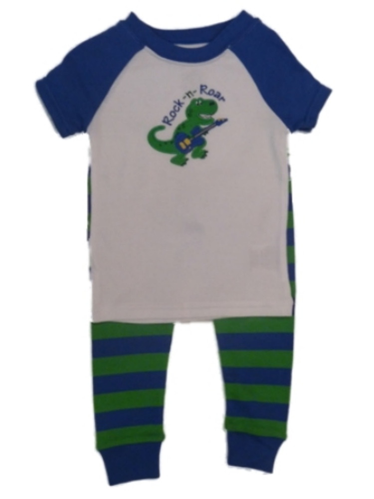 This darling infant and toddler boys pajamas set features a dinosaur playing a guitar and the words, "Rock N Roar."