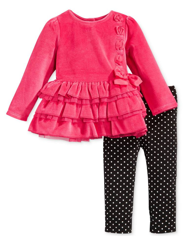 This darling 2 piece holiday baby outfit features a ruffled pink velour shirt and black and white polka dot stretch pant leggings.