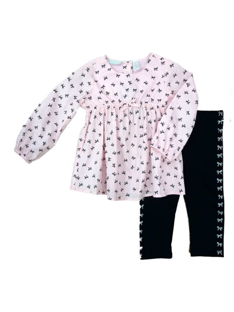 This darling 2 piece baby outfit includes a pink long sleeved top with black bow print and silver glitter dots allover, and black stretch leggings with silver glitter bow print.
