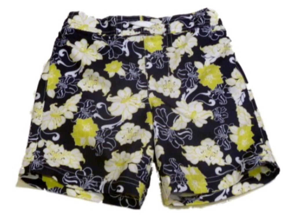 These cute swim trunks are Hawaiian Style. They are navy blue with lime green and white flowers