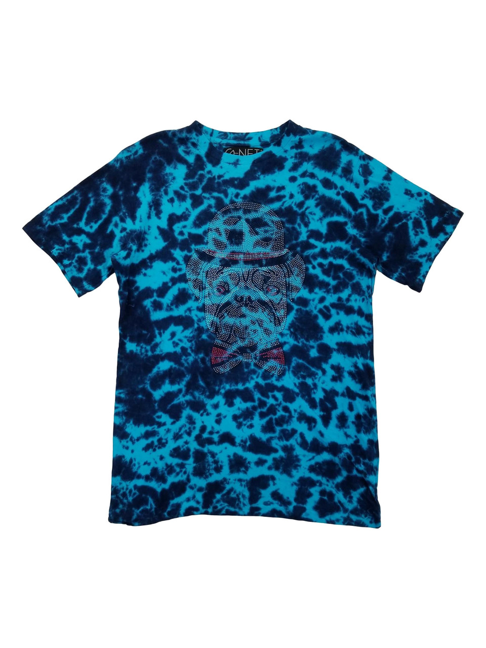 - G-Net Mens Blue Tie-Dye Rhinestone Pug Dog Hat & Bow Short Sleeve T-Shirt