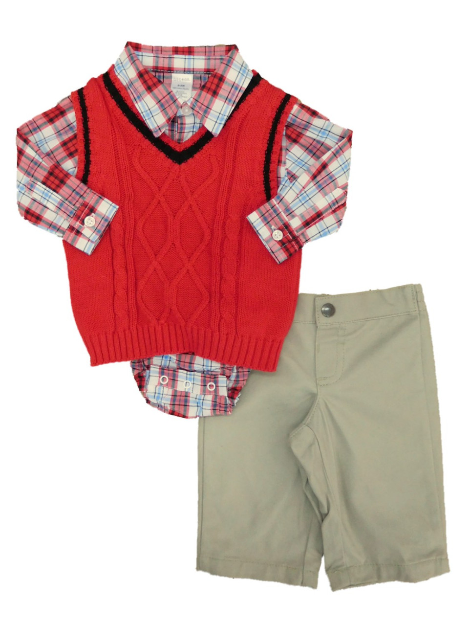 - George Infant Boys 3P Holiday Outfit Red Sweater Vest Bodysuit & Khaki Pants