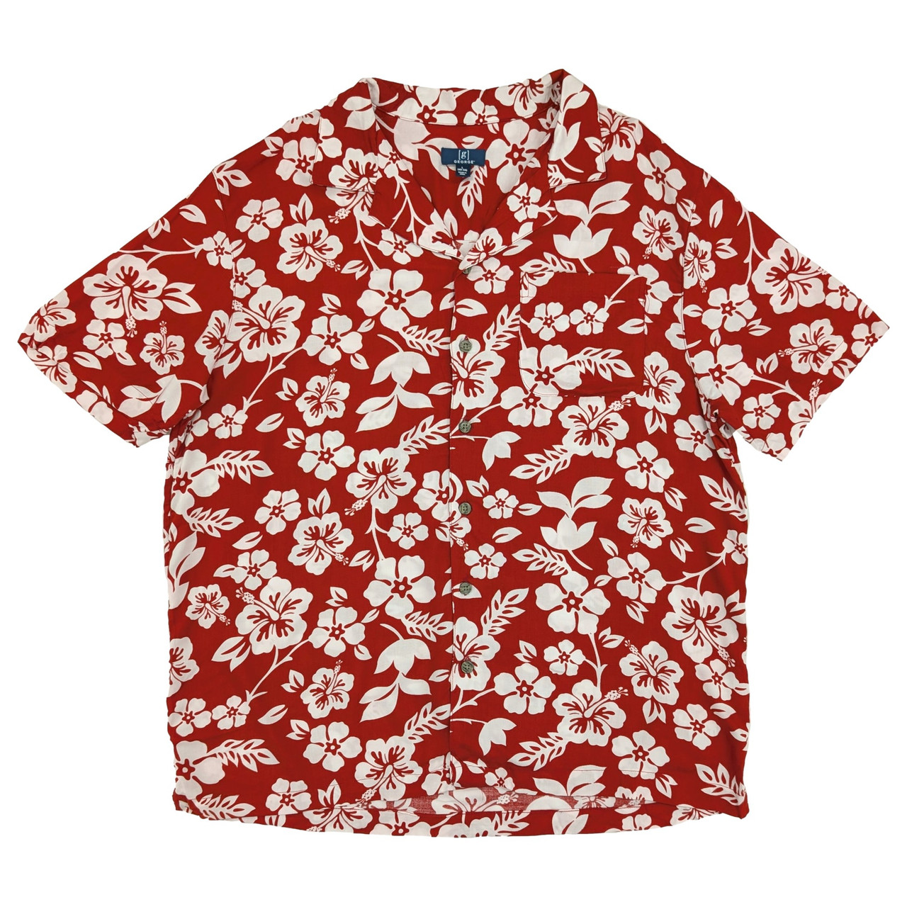 - George Mens Red & White Hibiscus Short Sleeve Button-Up Camp Shirt