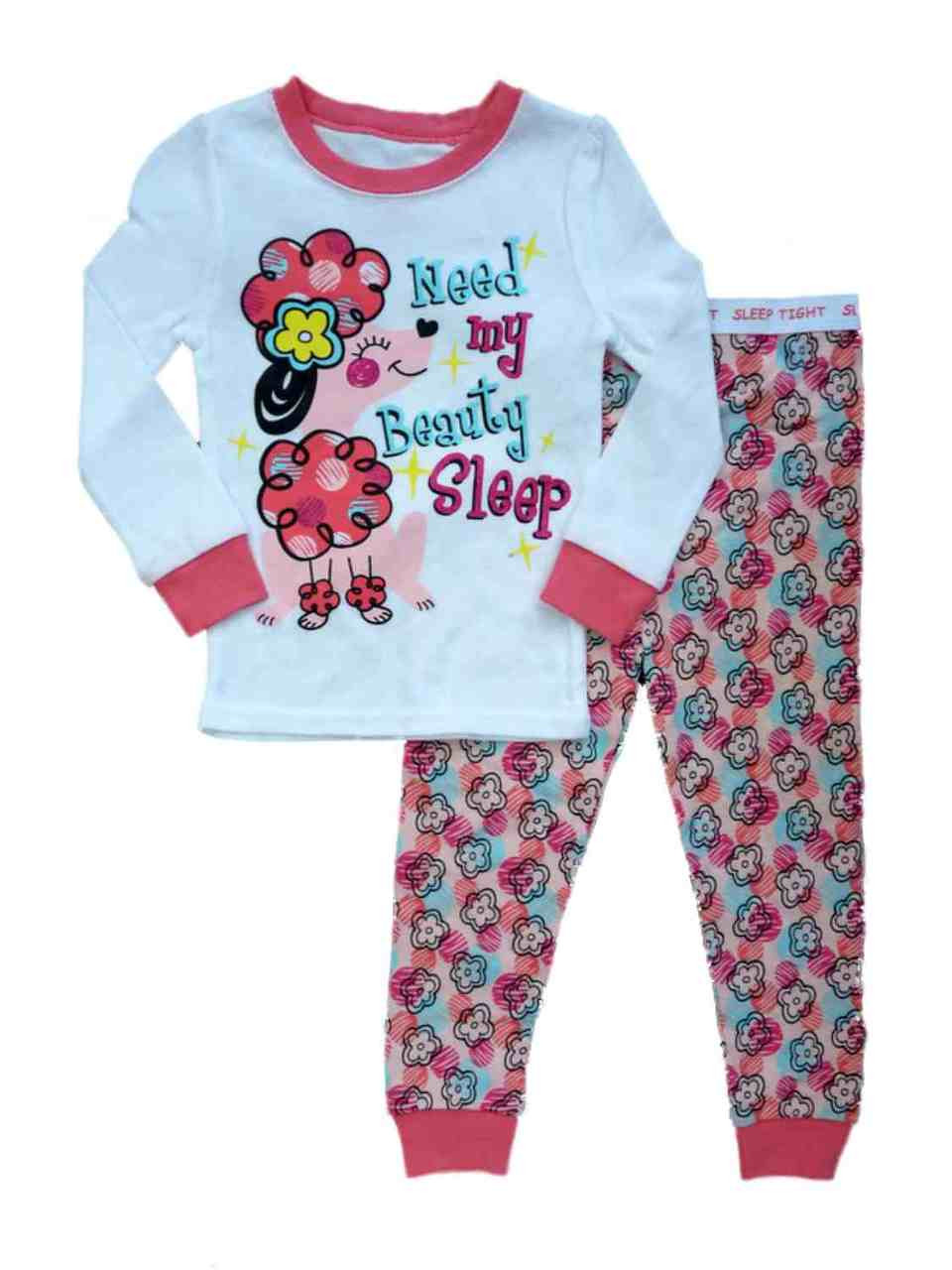 This cozy 2 piece sleepwear set includes a white long sleeved top with a poodle graphic and "Need My Beauty Sleep" printed in glitter on the front, and peach elastic waist sleep leggings with flower print allover.