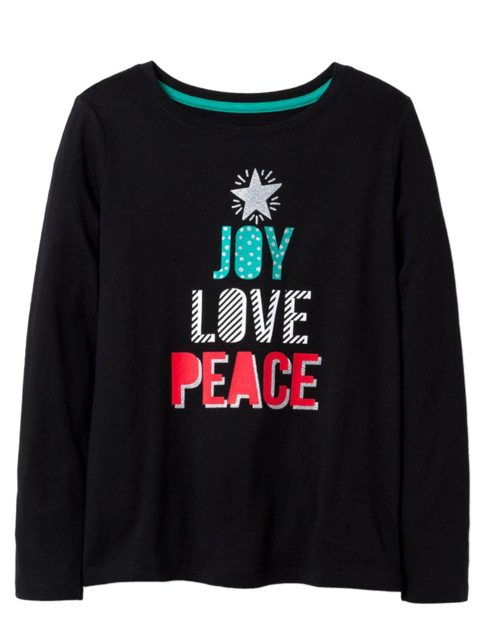 This adorable girls black "Joy, love, peace" Christmas star shirt is sure to be a holiday favorite!