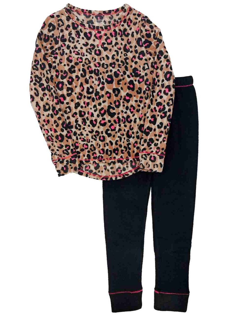 - Girls Brown Leopard Print Long Johns Fleece Underwear Base Layer Set