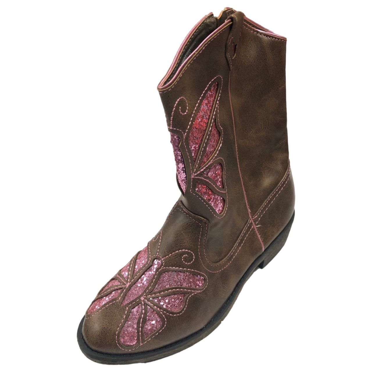 She will love wearing these adorable brown & pink sparkle butterfly themed zip side cowboy boots!