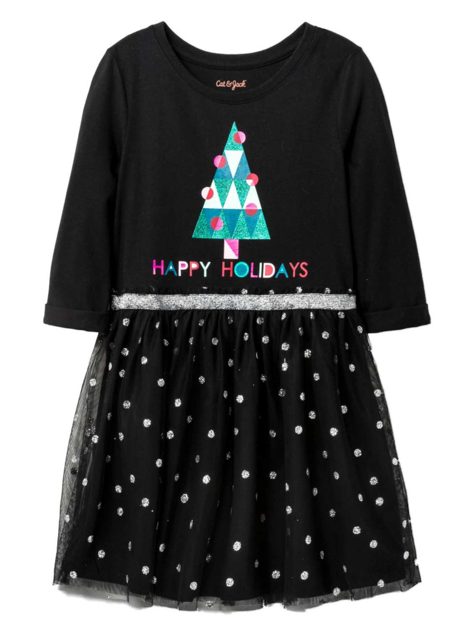 - Girls Gray Black & Silver Sparkle Happy Holidays Tulle Christmas Tree Dress