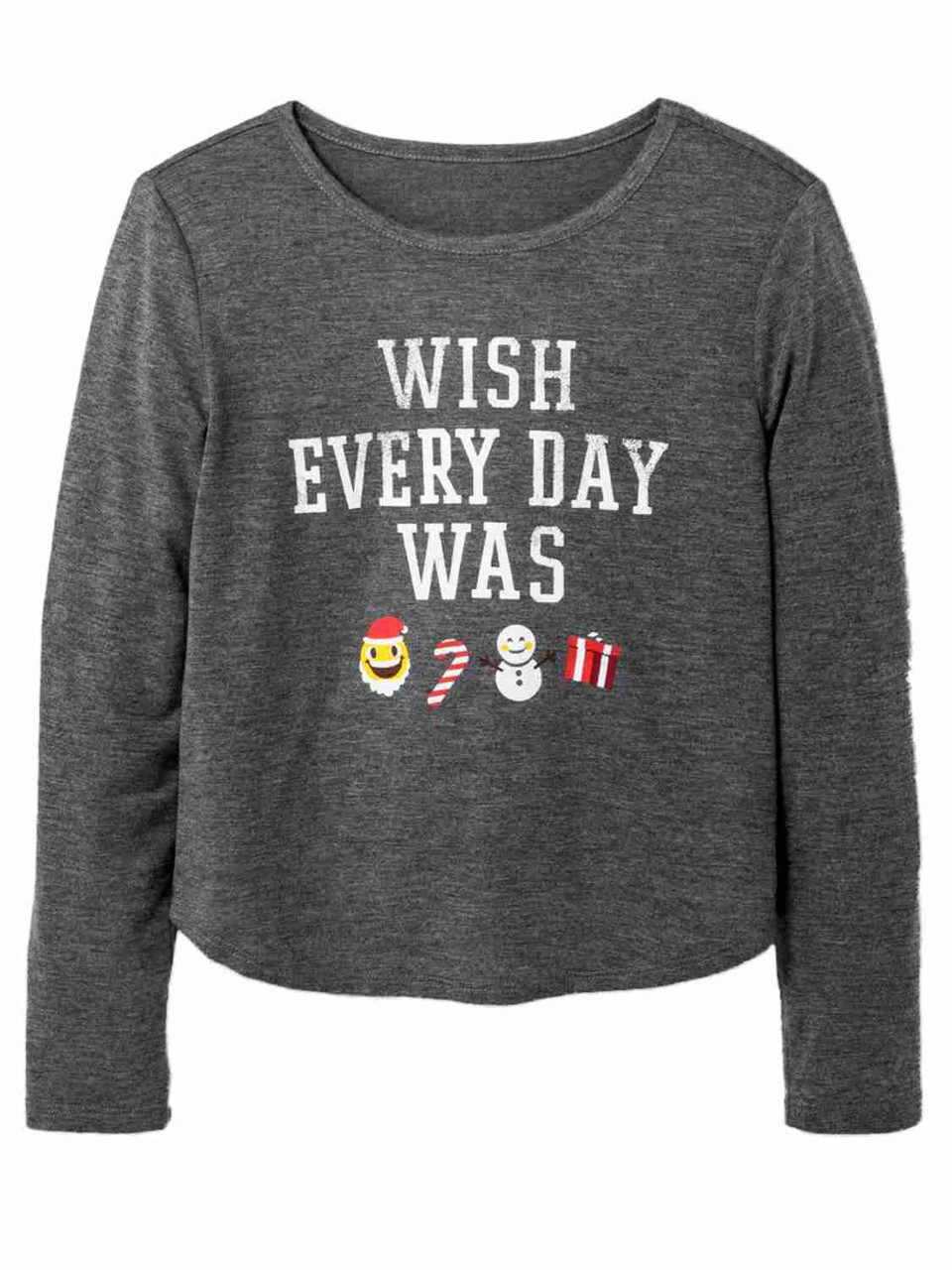 This adorable girls gray Christmas shirt features the words, " Wish everyday was Christmas" along with holiday themed emoji guys.
