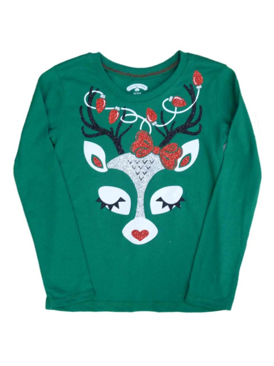 This cute green long sleeved t-shirt with a glittery reindeer graphic is sure to a Holiday favorite!