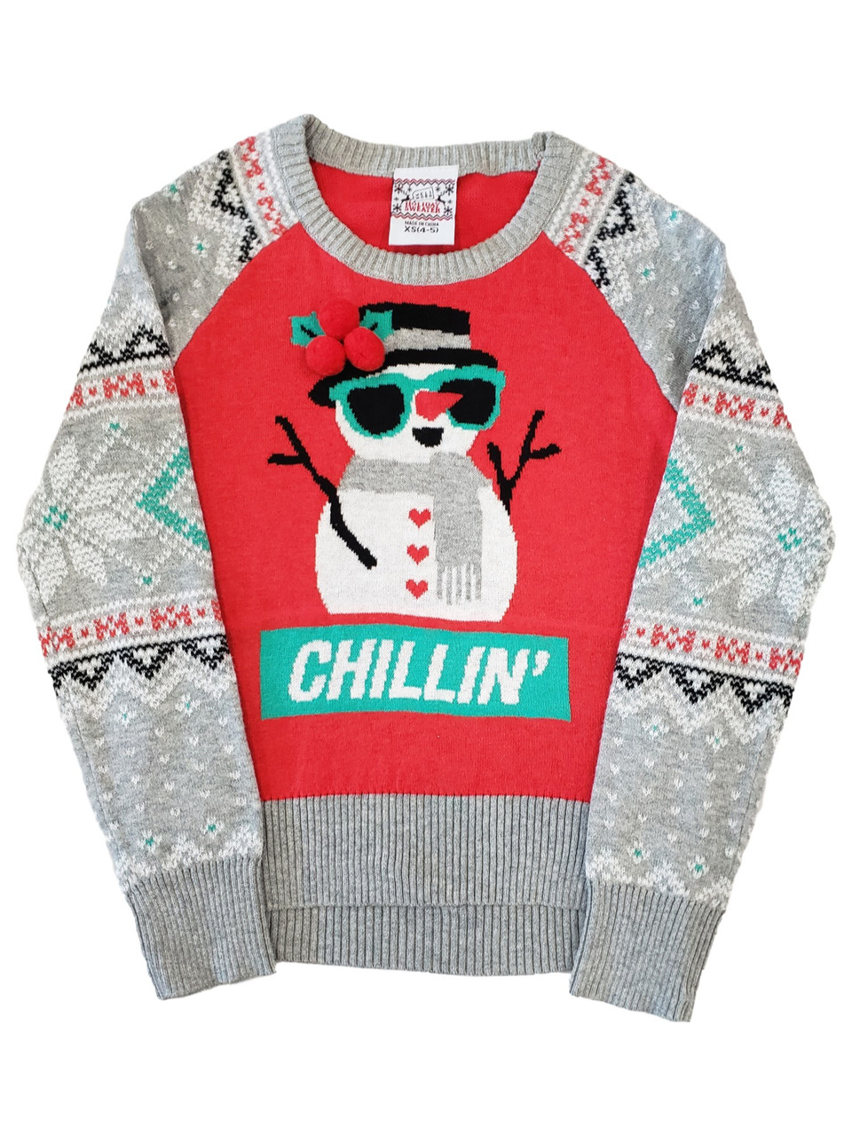 - Girls Grey Red Chillin Snowman Long Sleeve Knit Cotton Christmas Sweater