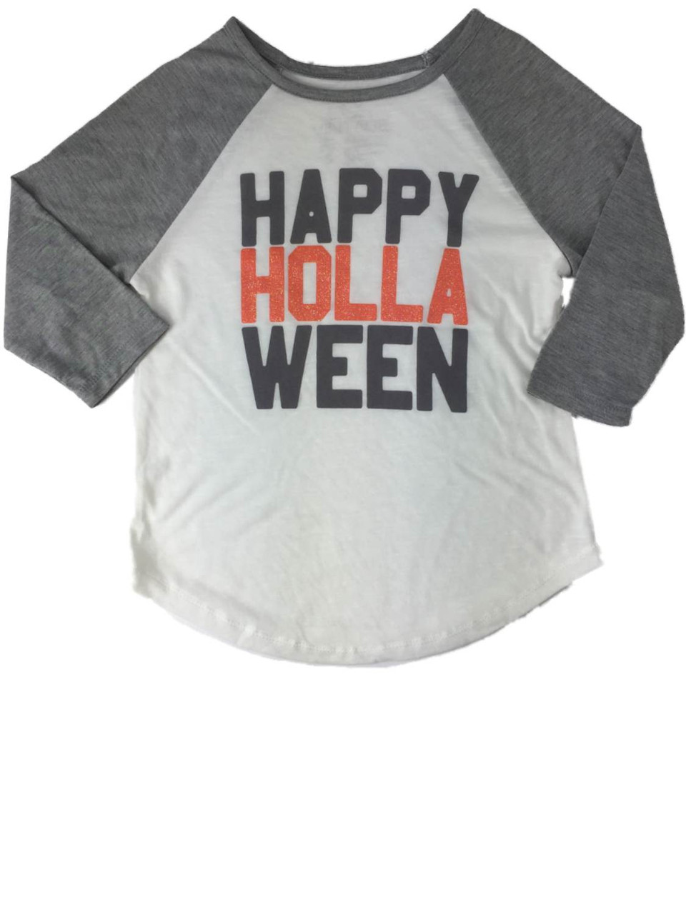 - Girls Happy Hollaween Gray White & Orange Glitter Halloween Baseball T-Shirt