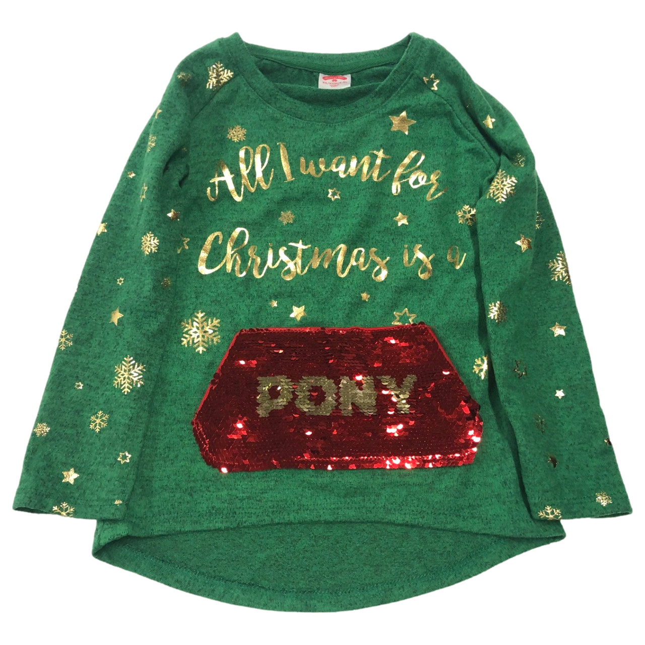 She will love wearing this super soft long sleeved green & red flip sequin "All I want for Christmas" pony, & unicorn tee shirt this holiday season!