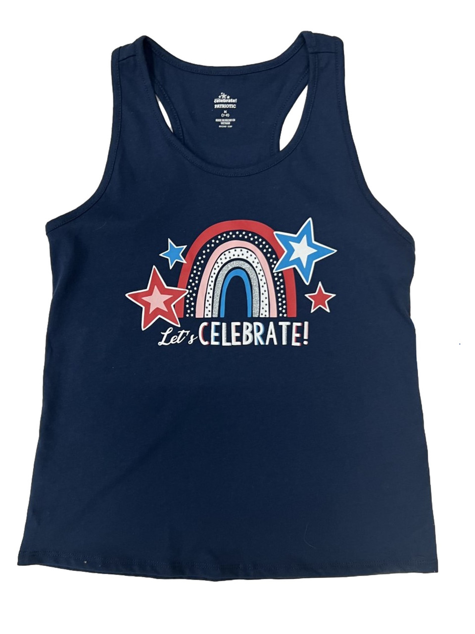 This adorable navy blue "Lets Celebrate" patriotic tank top is perfect for the 4th of July or anytime you want to show off your American pride!