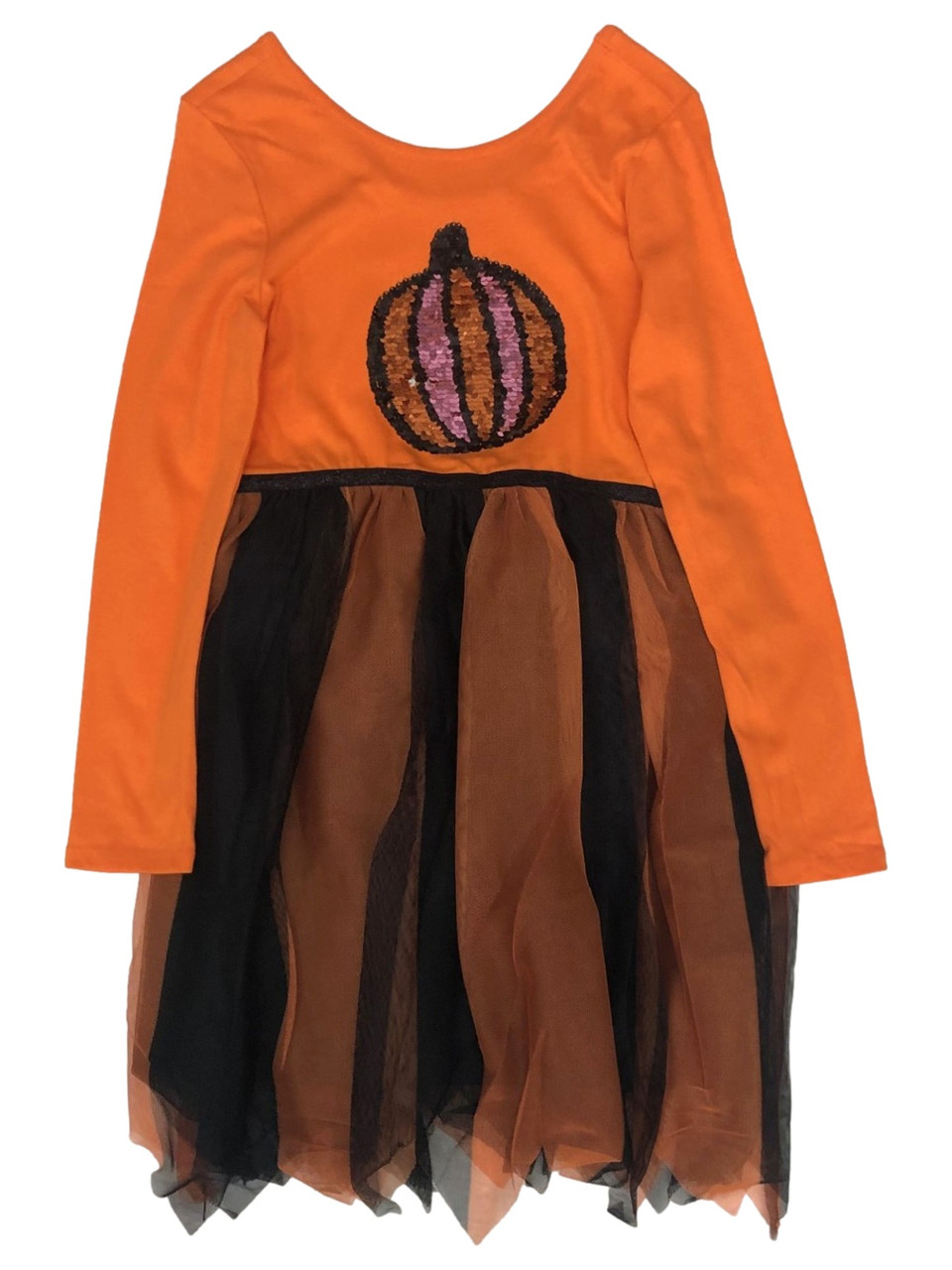 - Girls Orange & Black Halloween Themed Tulle Flip Sequin Pumpkin Dress