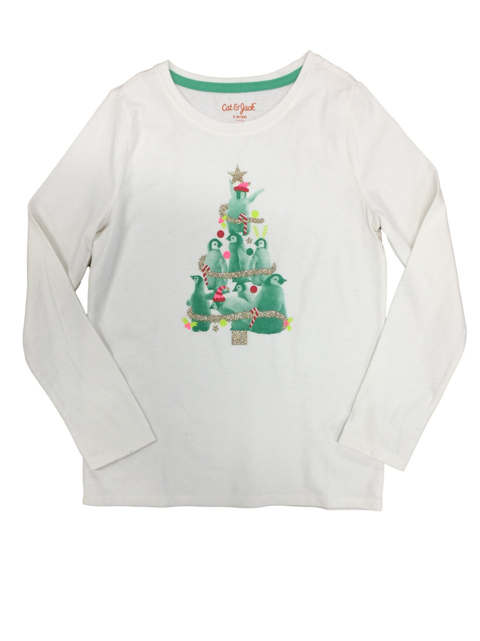 - Girls Penguin Christmas tree Glitter Long Sleeve T-Shirt Holiday Top