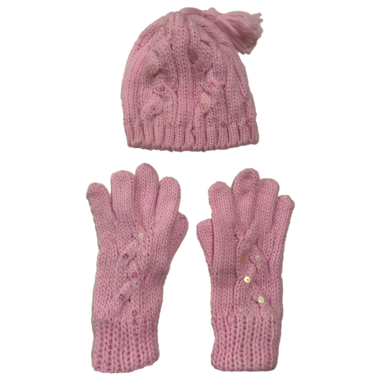 - Girls Pink Sequin Cable Knit Beanie & Gloves Set
