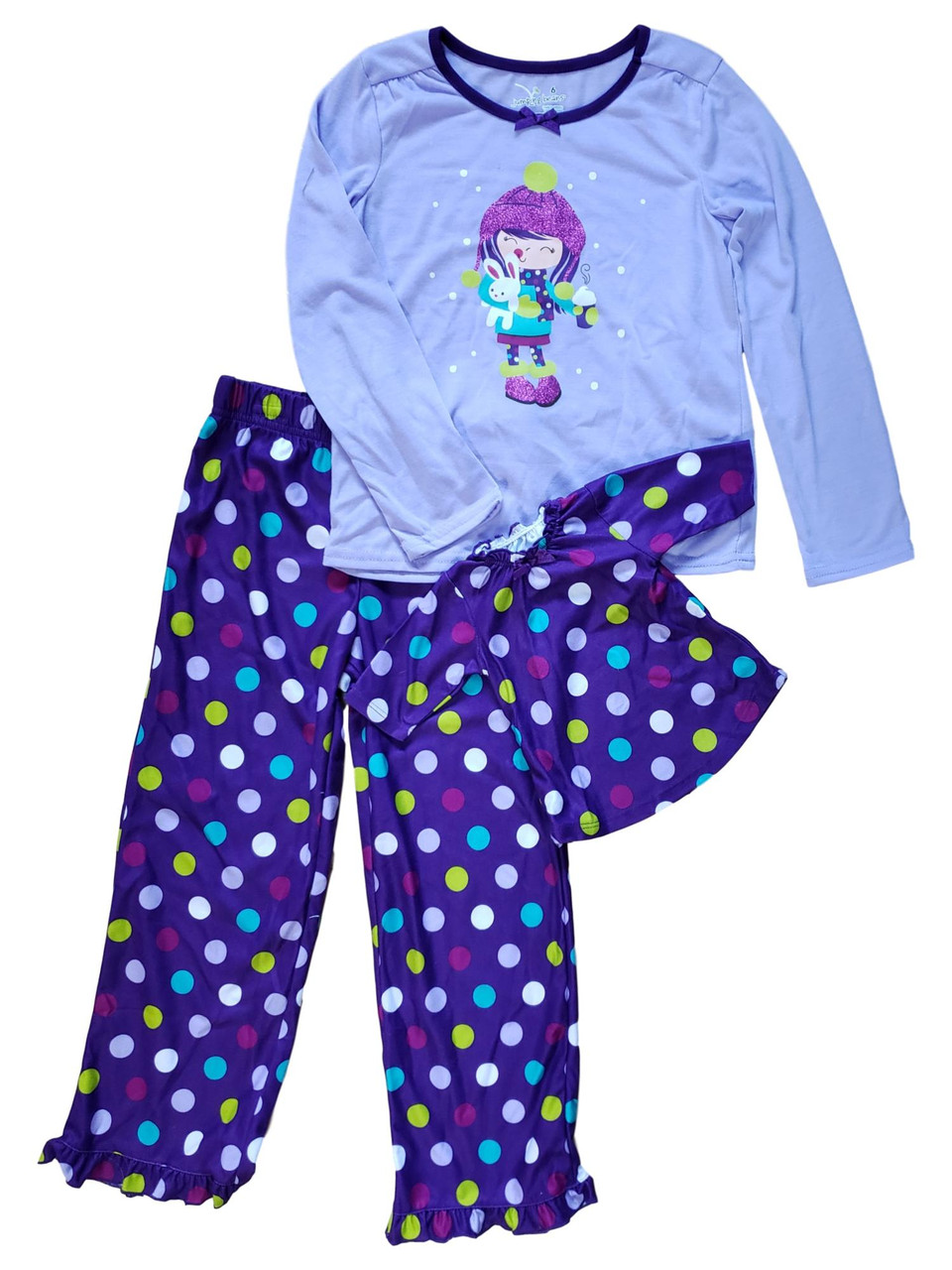 - Girls Purple Polka Dot Print Glitter Pajama PJ Set & Doll Sleep Dress