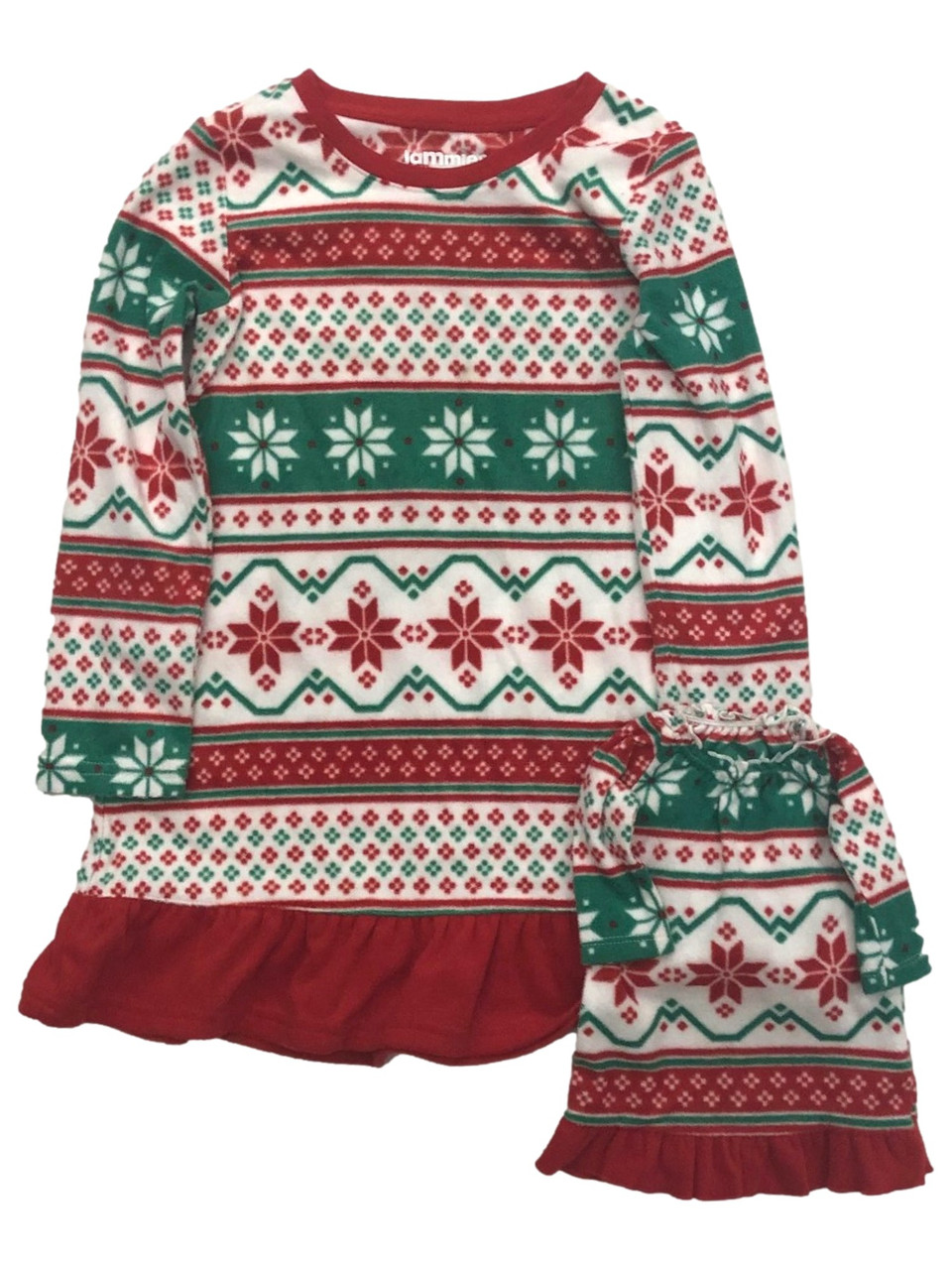 - Girls Red & Green Snowflake Fleece Holiday Nightgown & Doll Night Gown Set