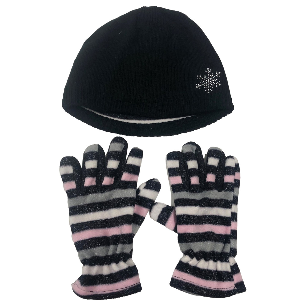 - Girls Reversible Black Fleece Stripe & Snowflake Theme Beanie Hat & Gloves Set