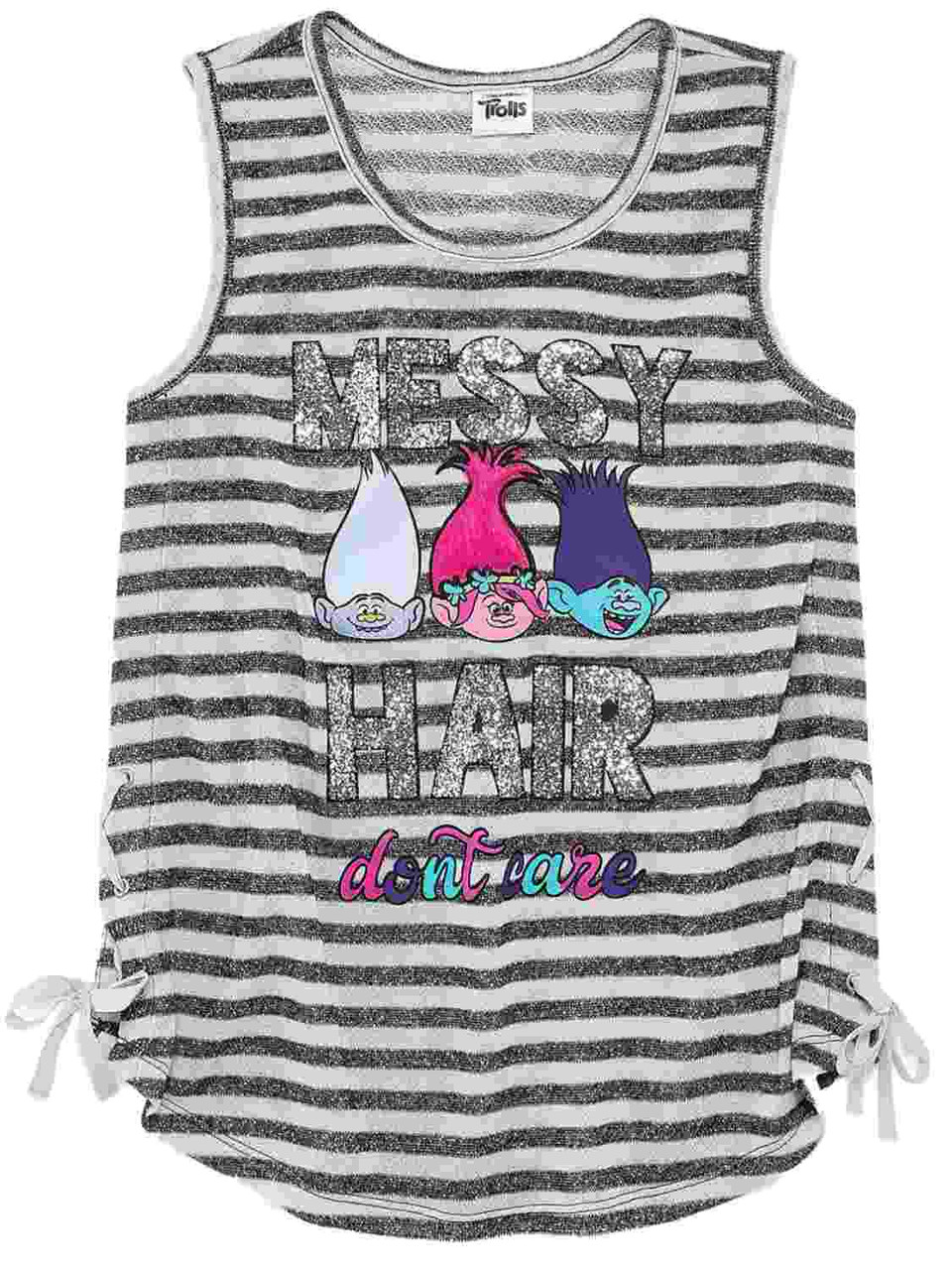 - Girls Trolls Movie Messy Hair Don't Care T-Shirt Gray Stripe Poppy Tank Top