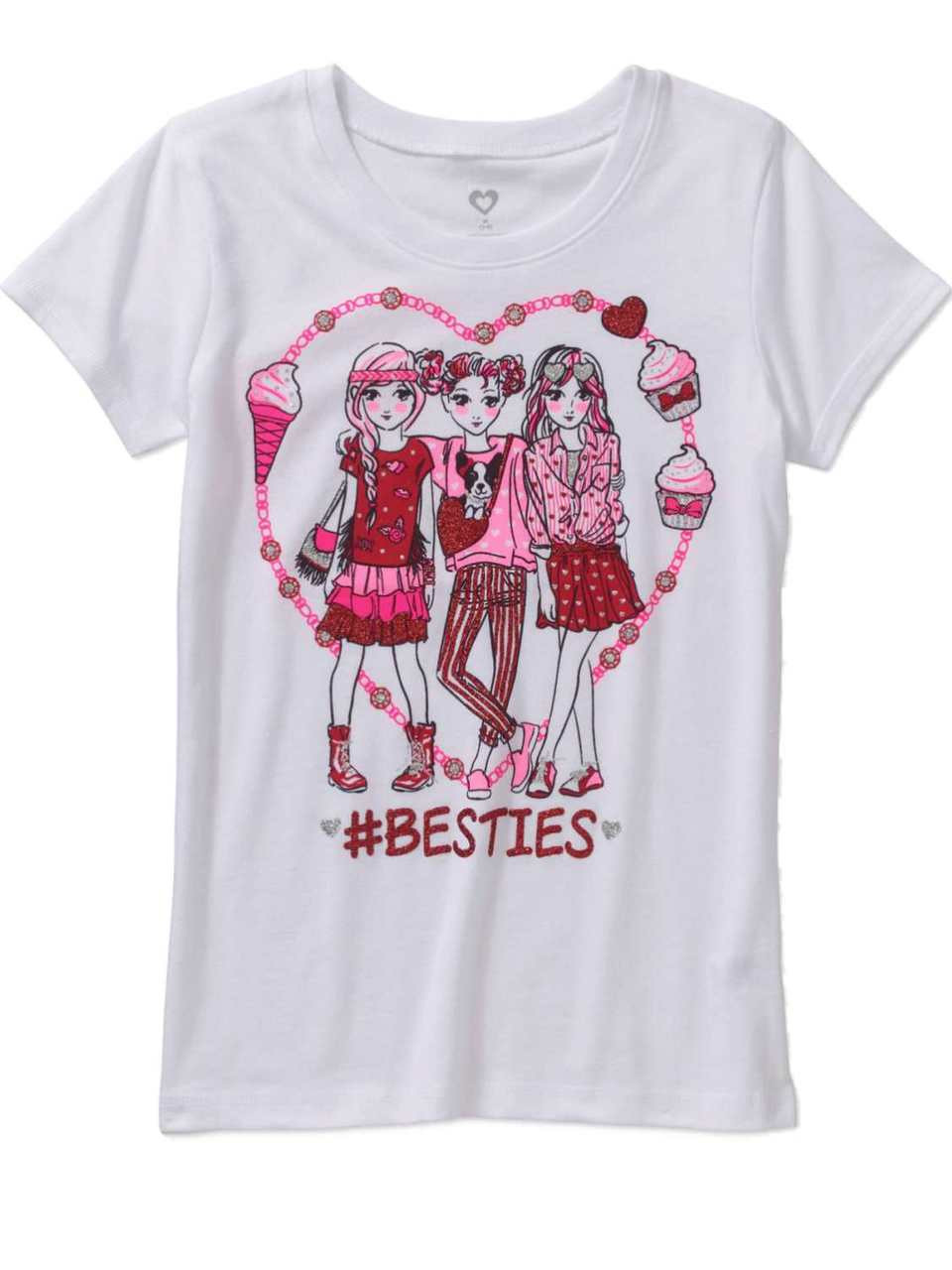- Girls White Glitter Besties Valentines Day Tee Shirt Heart T-Shirt