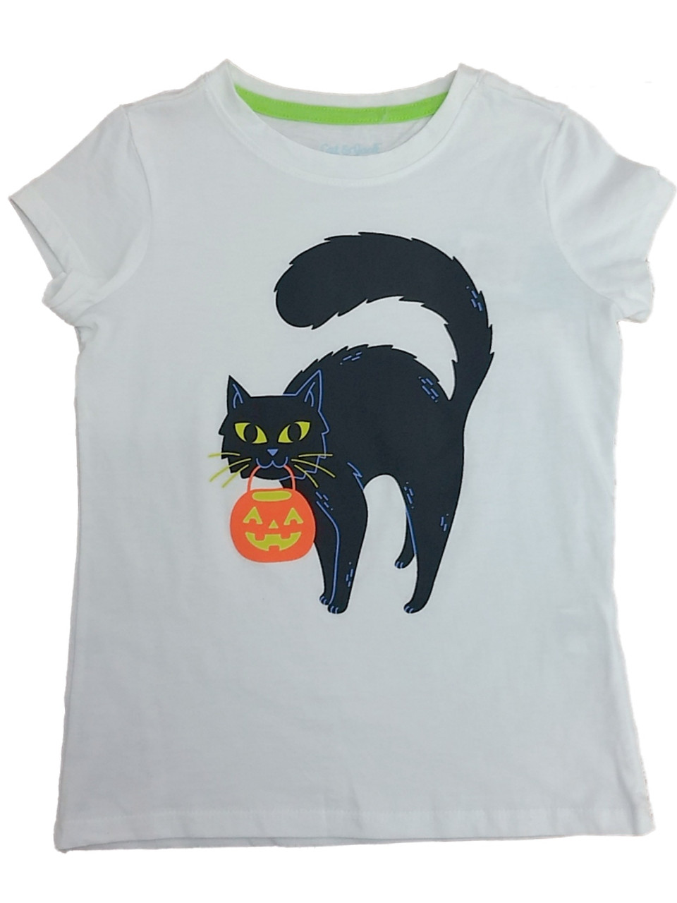 - Girls White Halloween T-Shirt Trick Or Treat Black Cat Tee Shirt