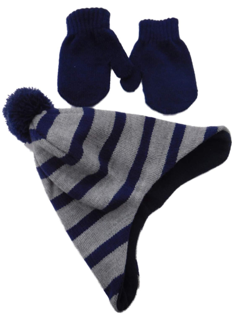 - Toddler boys Gray & Navy Striped Trapper Hat & Mittens Set