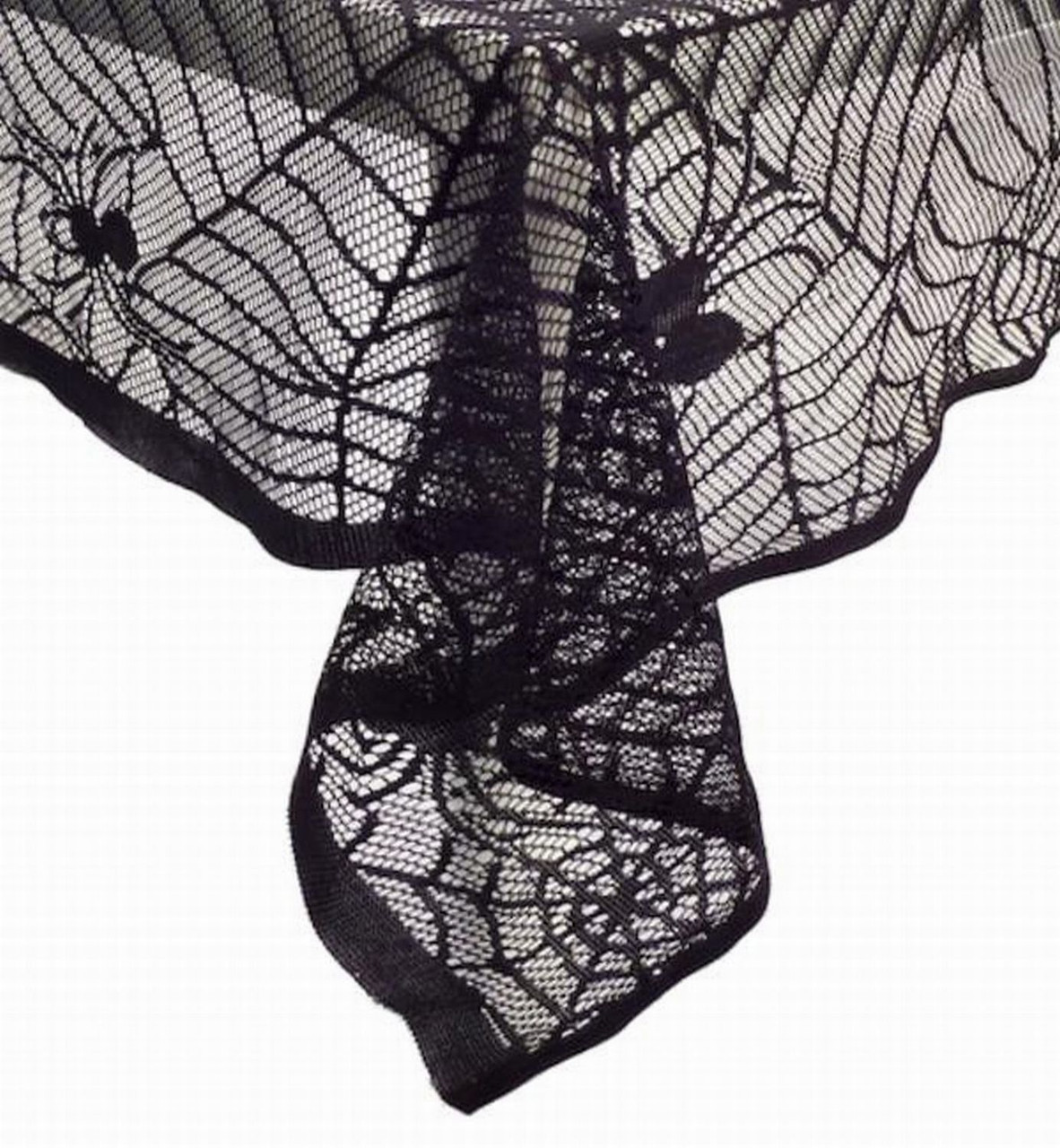 This pretty Halloween fabric tablecloth has an great look. It features black lace spiderweb pattern with spiders woven in. It will add style to any table