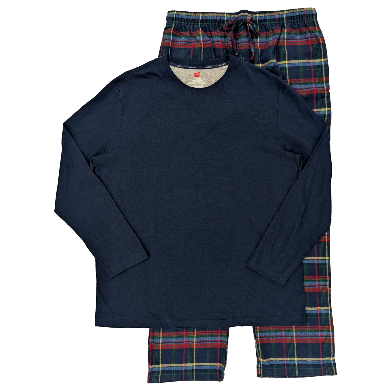 - Hanes Mens Navy Blue Knit Top & Plaid Flannel Pant Sleep Set
