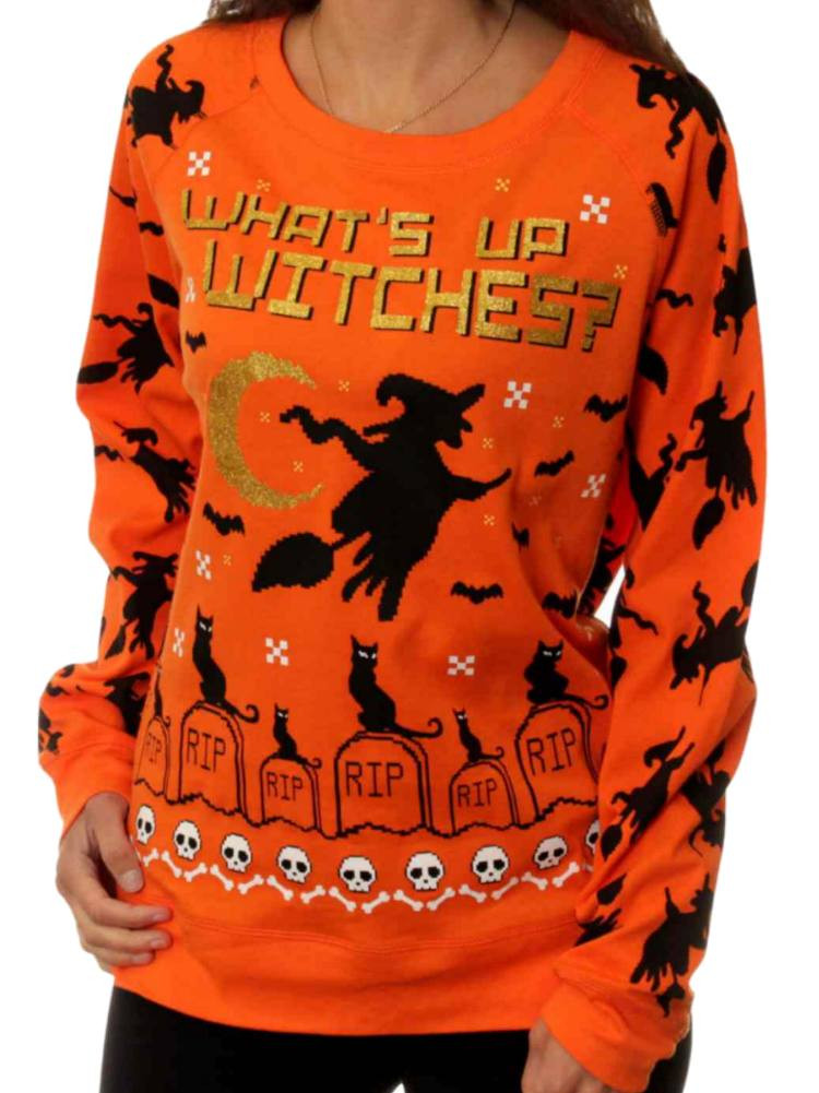 This cozy orange long sleeved sweatshirt with the phrase "What's Up Witches?" features spooky cats, bats, witches, and skulls in "ugly sweater style" pattern. It is sure to be a Halloween favorite!