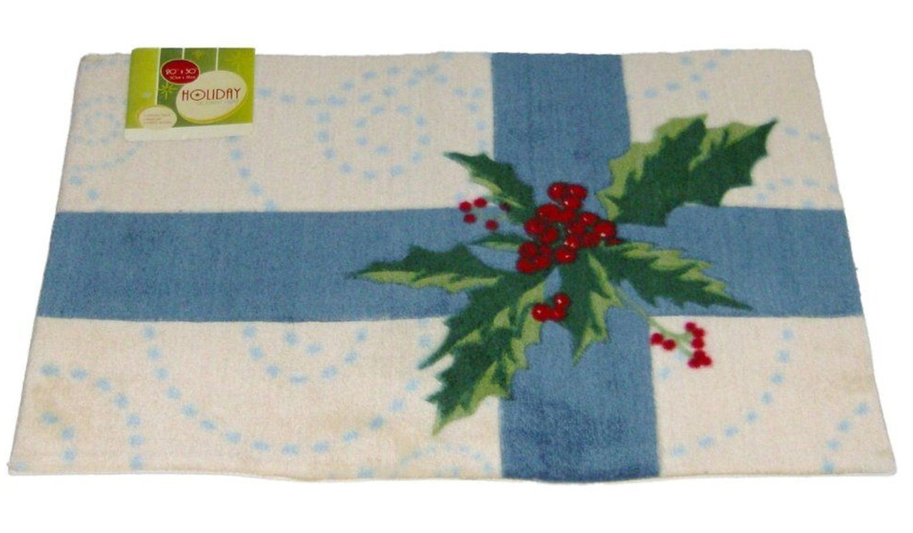 - Holiday Door Mat Blue Bow & Holly Plush Throw Accent Rug