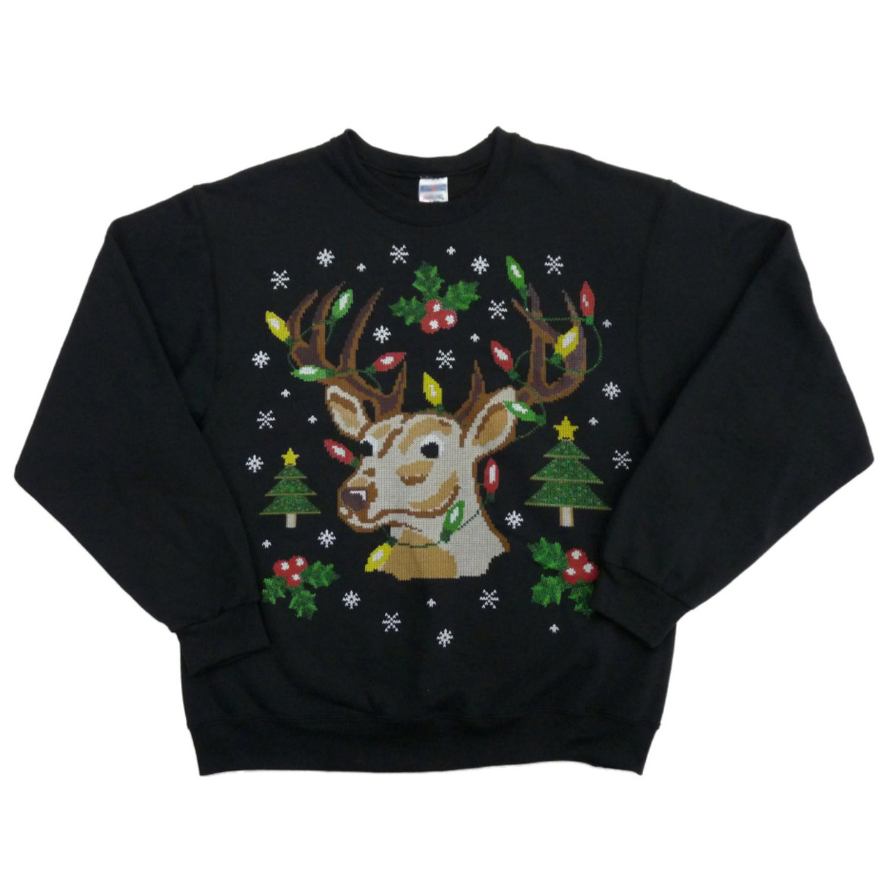 This fun Christmas sweater features a reindeer with Christmas tree's, lights, mistletoe and snowflakes. Perfect for holiday parties!