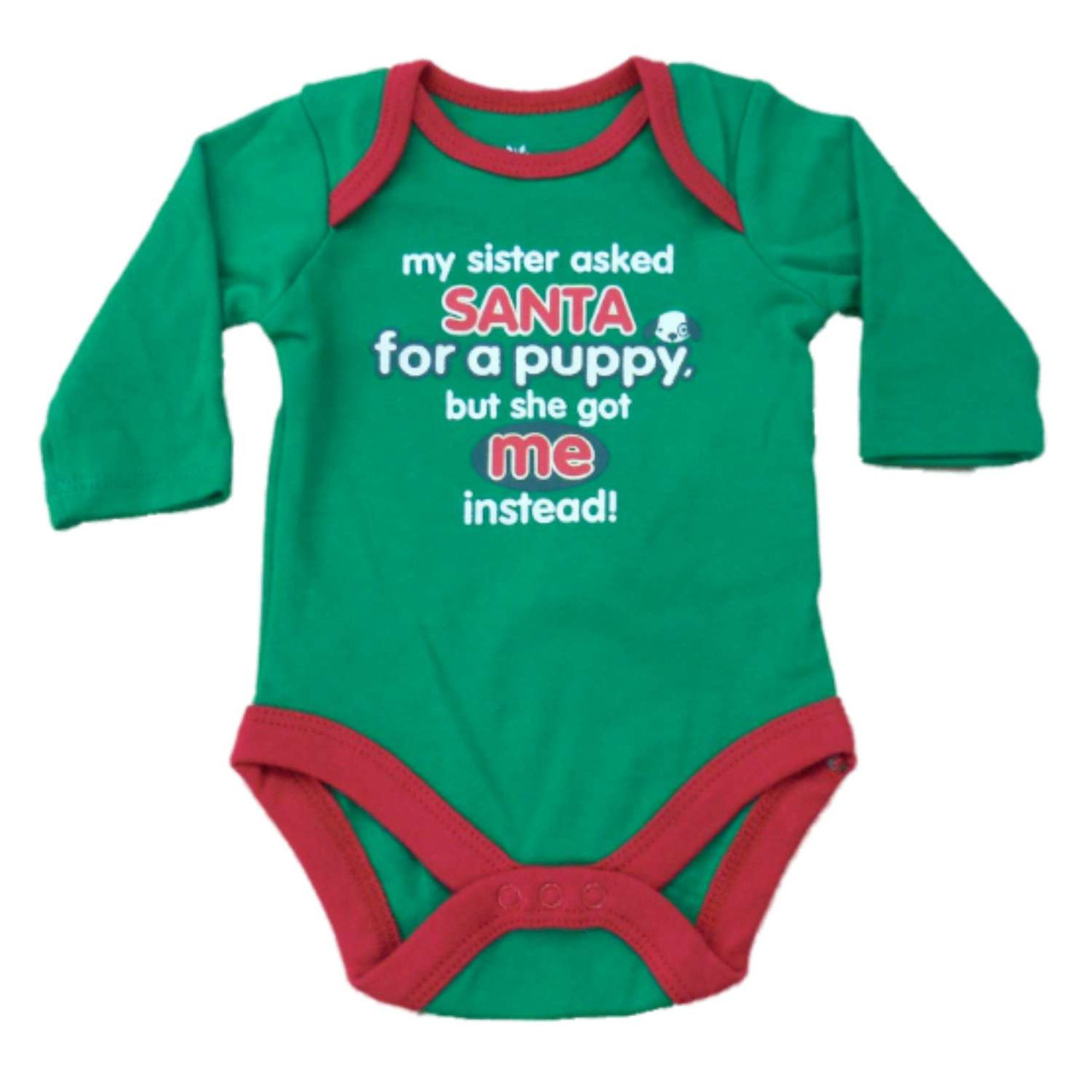 This adorable baby boy's green bodysuit says "My sister asked Santa for a puppy, but she got me instead!" and is perfect for holiday or everyday use.