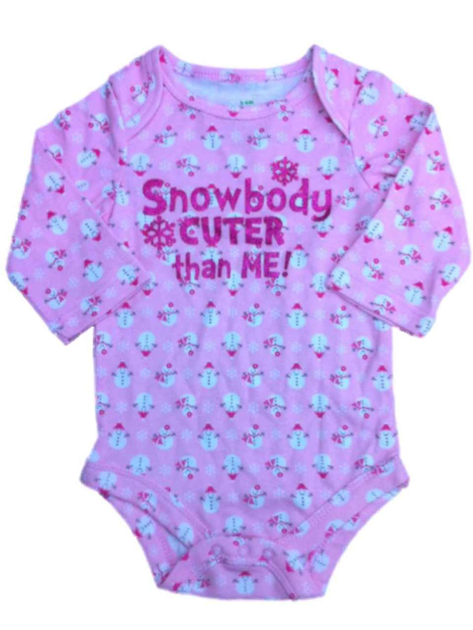 This cute baby girls pink snowgirl patterned bodysuit says "Snowbody cuter than me!" and is perfect for Holiday or everyday use!